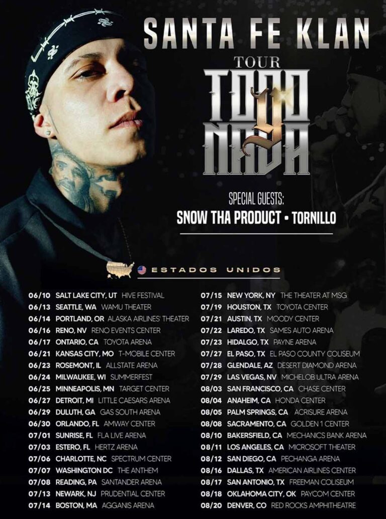 Santa Fe Klan Tour Usa 2024. Santa fe klan is touring the usa in 2024, featuring special guests snow tha product and tornillo, promising an unforgettable show. Santa fe klan is currently touring across 2 countries and has 36 upcoming concerts.